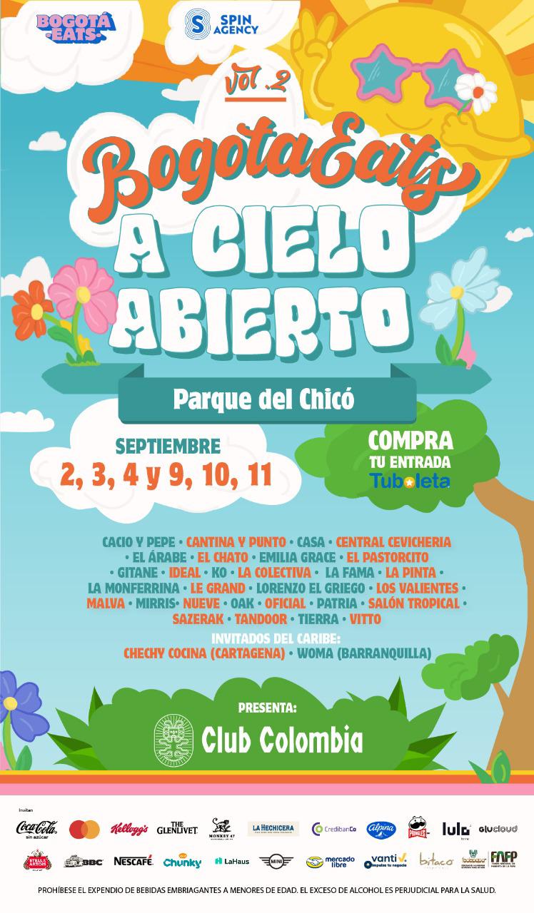 “BogotaEats a Cielo Abierto Vol.2” espera recibir a más de 50.000 personas, quienes podrán deleitarse con platos de reconocidos restaurantes como Cacio y Pepe, La Fama, Oficial, Central Cevichería, Ideal, La Pinta, Casa, Patria, Gitane, Sazerak, Tandoor, El Pastorcito, La Colectiva, Cantina y Punto, Emilia Grace, Lorenzo El Griego, Salón Tropical, La Monferrina, El Arabe, Ko, Oak, El Chato, Nueve, Oculto, Malva, Le Grand, Vitto, Tierra, Woma, Chechy Cocina y Mirris. Cada uno de ellos se presentará con dos platos: un plato insignia, el más famoso del restaurante, y el otro creado e inspirado exclusivamente para el festival.