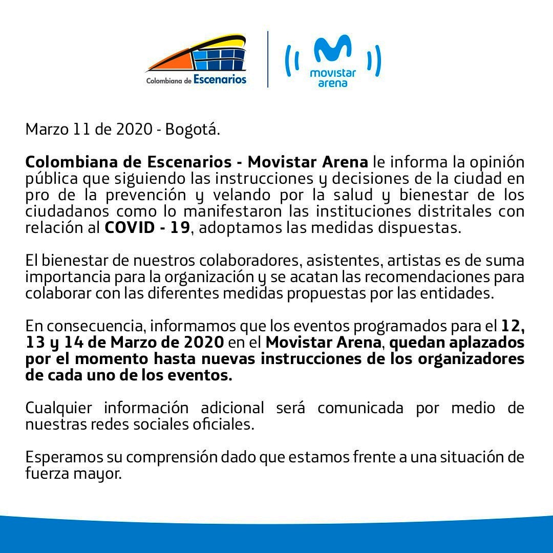 En consecuencia, informamos que los eventos programados para el 12, 13 y 14 de marzo de 2020 en el Movistar Arena, quedan aplazados por el momento hasta nuevas instrucciones de los organizadores de los eventos".
