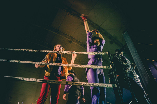 Con un ring de boxeo en el escenario, Win Butler, Régine Chassagne, Jerry Gara, Richard Reed Perry, Will Butler y Tim Kingsbury surgieron como luchadores. Una presentación típica de pelea de boxeo dio paso a que llegaran a tomar su lugar y llenaran de música toda la carpa.