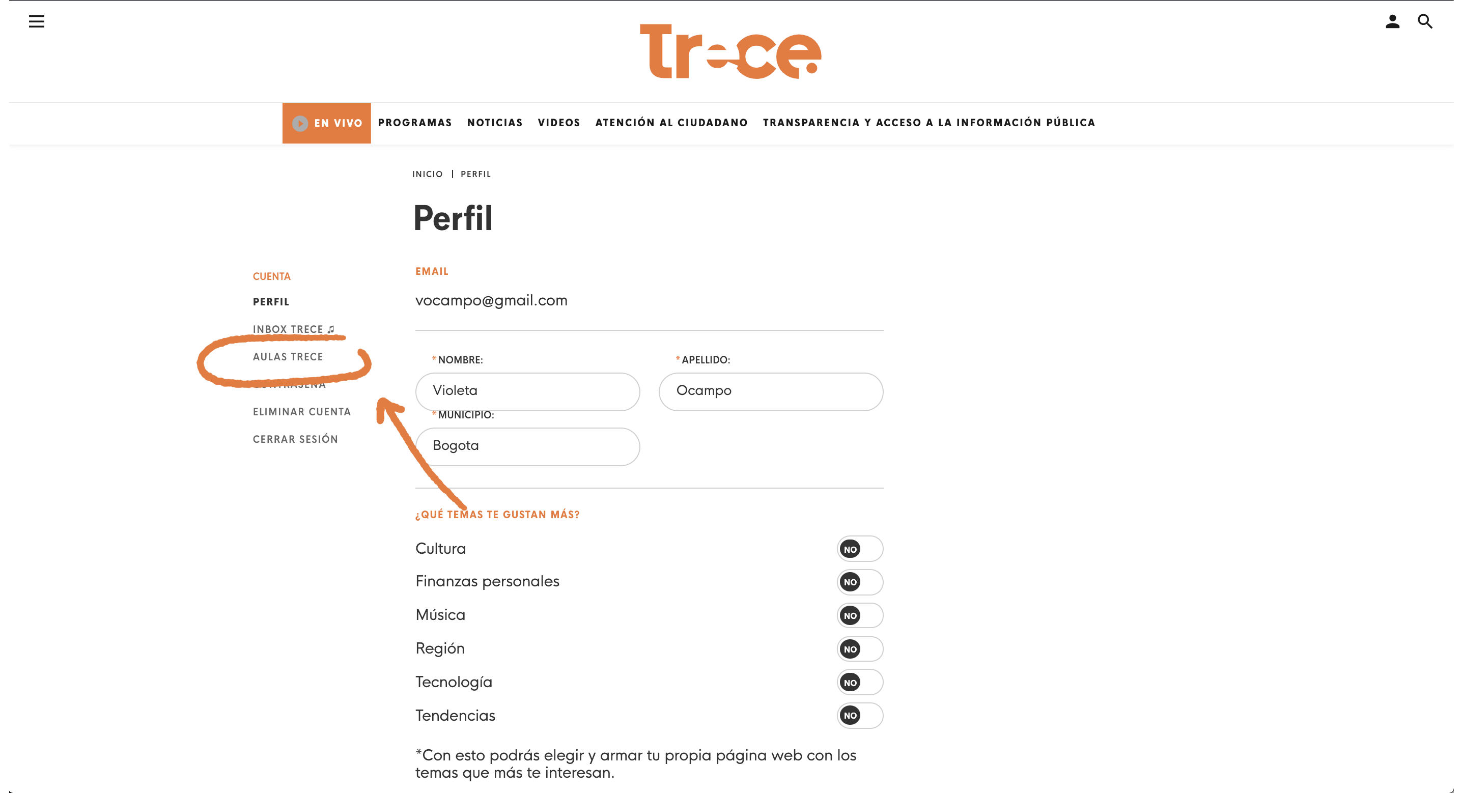 3. Bienvenido a tu perfil de Canal Trece Colombia. Puedes personalizar tus intereses en la información que recibirás de nosotros. ¡En la columna de la izquierda encontrarás la puerta de entrada a Aulas Trece!