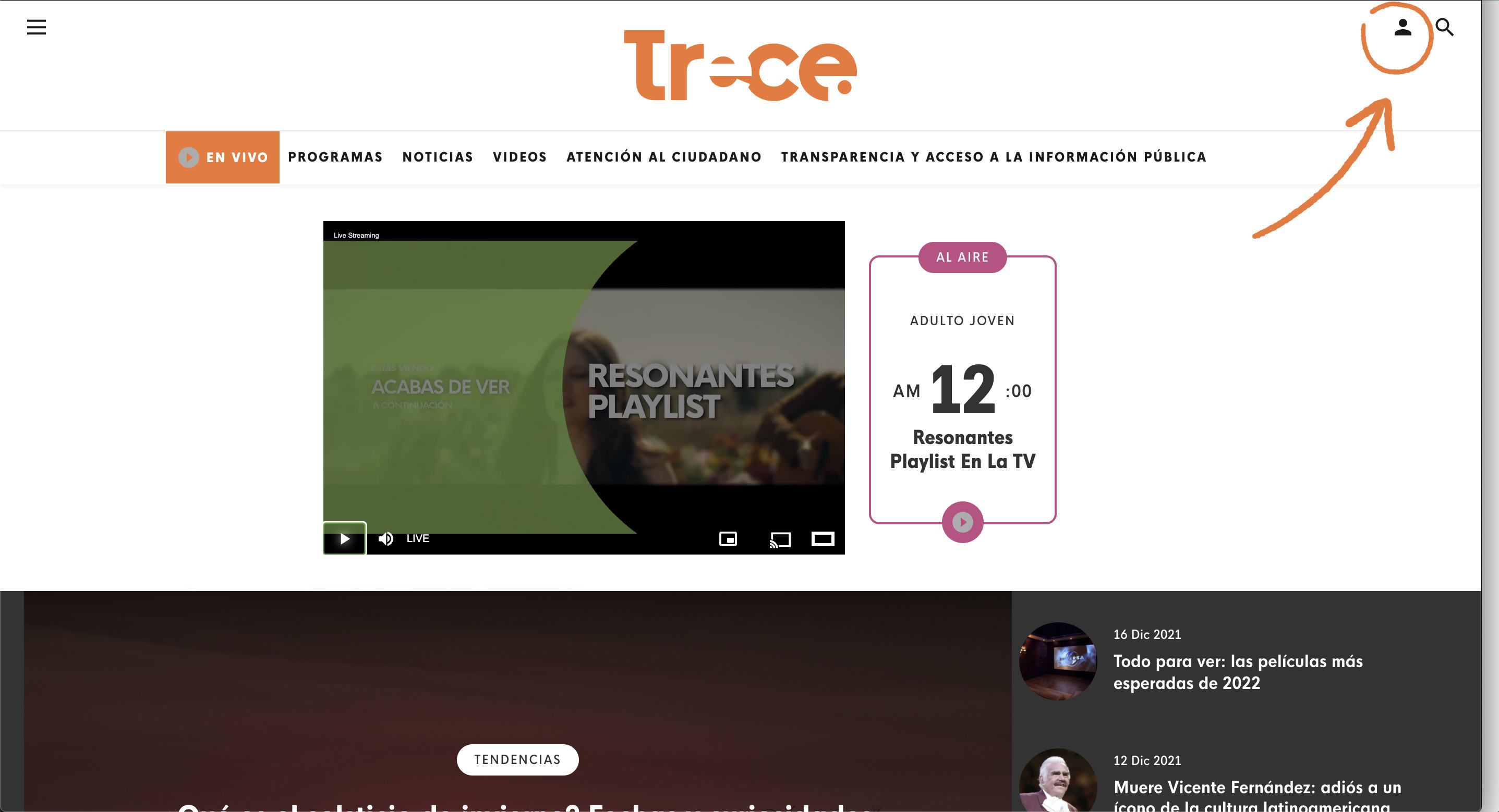 1. Lo primero que debes hacer es crear tu perfil en la página web de Canal Trece Colombia. En la parte superior encontrarás el ícono de perfil, dándole clic podrás crear el tuyo.
