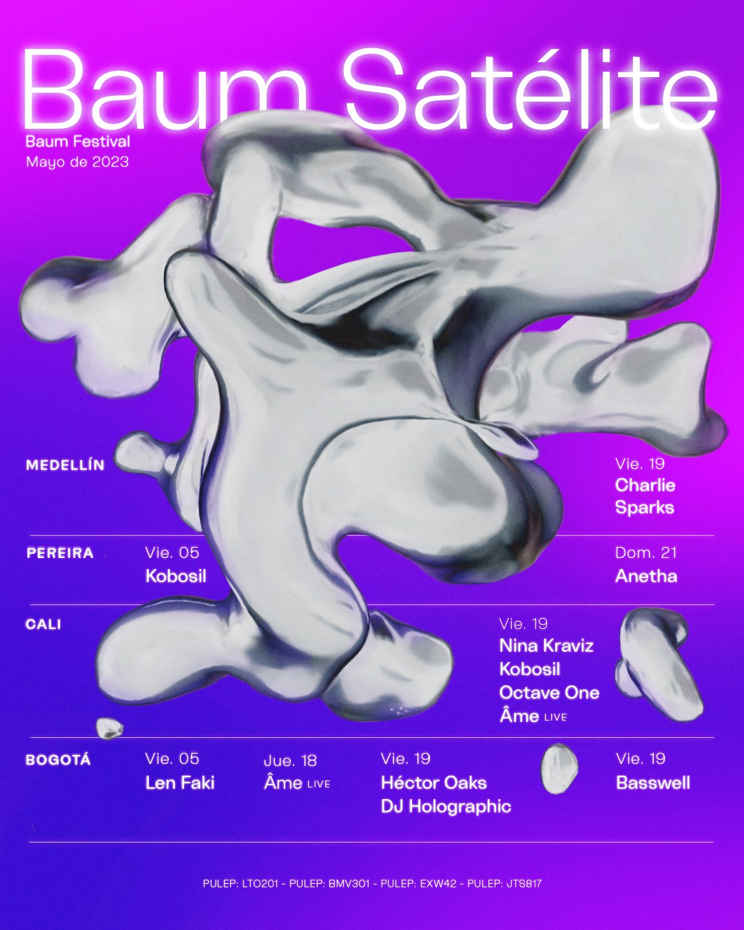 Con Baum Satélite podrás acercarte a los sonidos que llenarán las pistas de Bogotá. Nina Kraviz, Octave One, Anetha, Kobosil, Basswell, Len Faki y más artistas legendarios nos esperan para noches de fiesta imparables en tu ciudad.