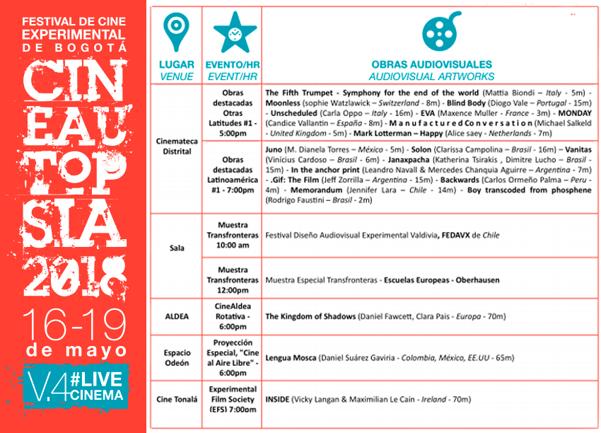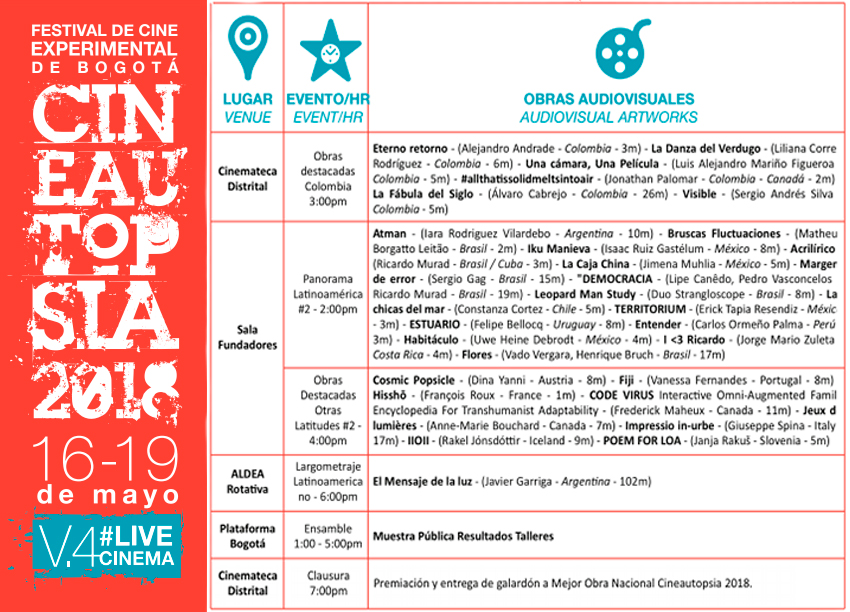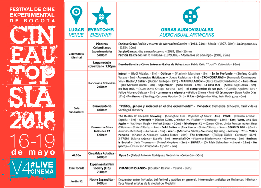 A partir de laboratorios de creación, conversatorios y encuentros con invitados, este año el gran tema de conversación será el ‘Live Cinema’ o ‘Cine en vivo’. El festival tendrá la presencia de Pedro Pablo Rocha, reconocido video artista brasileño y del Semillero de Investigadores Antioqueños de la Universidad de Antioquia.