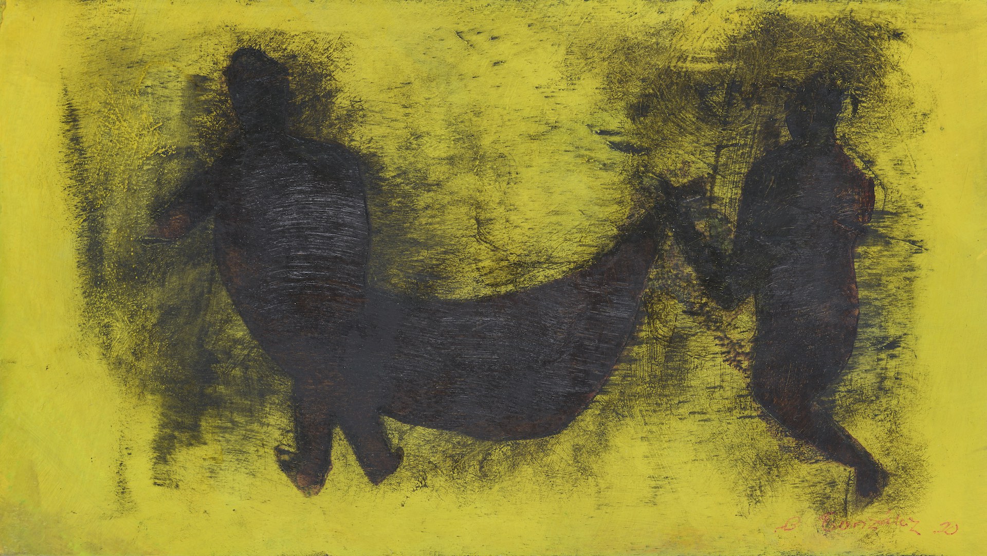 El proyecto, no obstante, encontró dificultades de conservación y cronograma que imposibilitaron su ejecución, y la obra permanece custodiando ese lugar. Este episodio se convirtió en una oportunidad creativa que extendió la vida de Auras anónimas hacia un nuevo trabajo de González, titulado A posteriori, donde seis de los ocho dibujos originales de Cargueros se repiten en pinturas convertidas en papel de colgadura, con tonos amarillos envejecidos por el tiempo, enmarcados en el negro robusto del arco de sus lápidas. Así, los cargueros repiten sus marchas fúnebres, pero sus contornos ahora se ven difusos, etéreos. “Aquí se retoma la intención que tiene mi obra, que es la repetición, porque hay que insistir mucho en Colombia, en ciertas frases, en ciertos pensamientos; es una insistencia en la situación del país, es una insistencia en que no se repita más”, señala la artista sobre esta obra, que desde este jueves 15 de septiembre estará extendida a lo largo y ancho de la sala principal de Fragmentos.