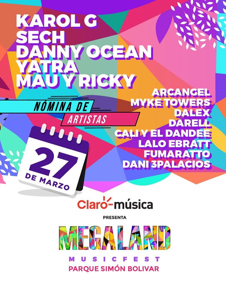 Megaland vuelve con nueva fecha y nuevos artistas luego de los imprevistos que conllevaron a su aplazamiento en su fecha del 2019 por temas de orden público en Bogotá. El evento finalmente se realizará este año con Karol G, Sech, Danny Ocean, Yatra, Mau y Ricky, Sebastian Yatra, Arcangel, Mike Towers, Dalex, Darell, Cali y el Dandee, Lalo Lebratt, Fumaratto y Dani 3 palacios. Entradas AQUÍ.