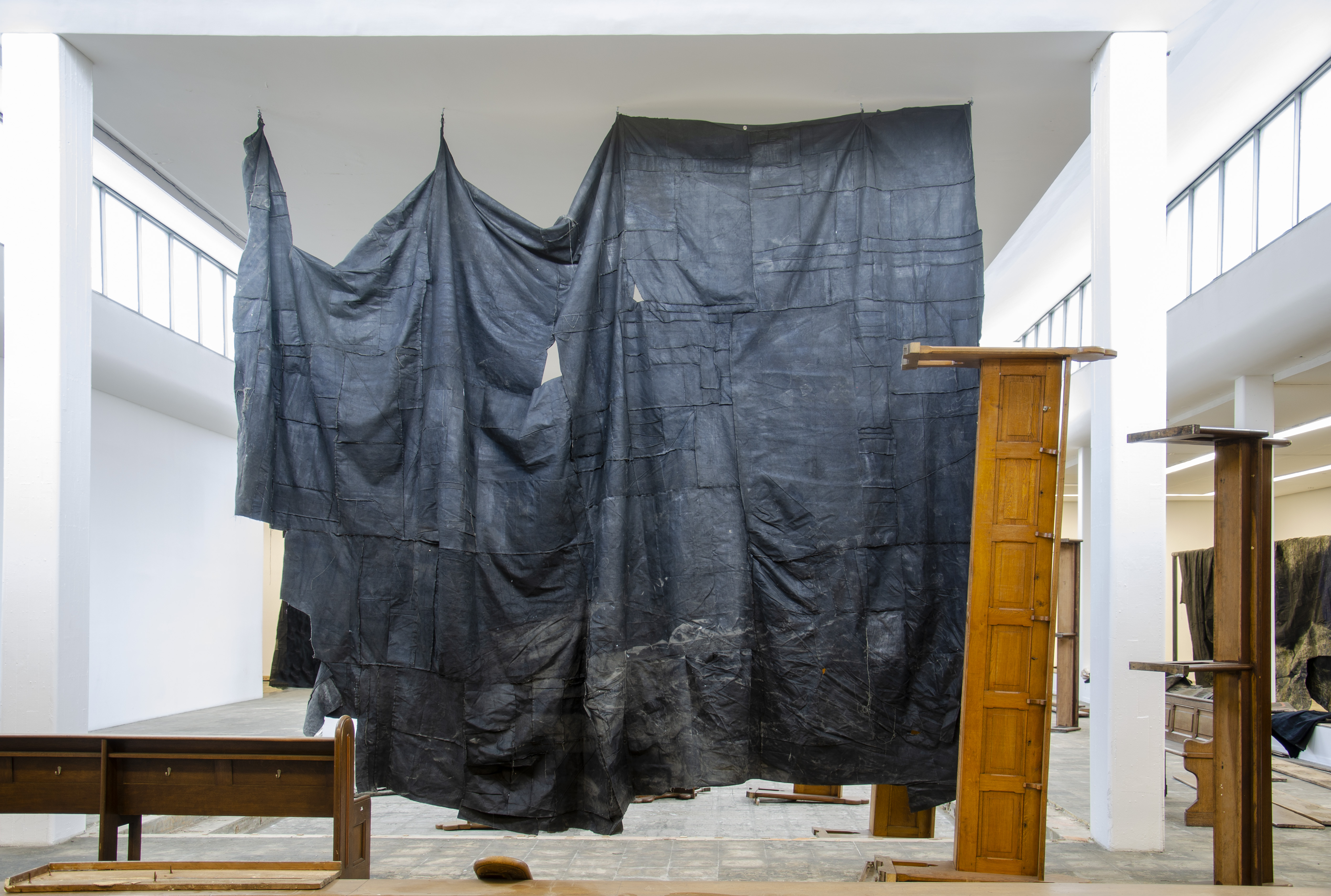 Condiciones aún por titular propone un recorrido que empieza en el patio duro del Museo de Arte de la Universidad Nacional con la instalación de más de 40 bancas del siglo XIX, de iglesias católicas que fueron excomulgadas y recogidas en bodegas de Holanda. Para el artista estas bancas son “una herramienta efectiva que ha sido distribuida e instrumentada por un proceso colonial. Van a tener una reencarnación en un contexto y en una geografía que históricamente ha sido sometida. Se vuelven un comentario simbólico sobre una opresión, la exterminación de una diversidad, que es el origen de nuestra problemática y condición actual”. Ubicadas unas sobre otras, crean una escultura de madera maciza soportada con hierro fundido sólido, el cual emula las garras del catolicismo en nuestra sociedad. Y desde ese mismo momento comienzan a aparecer las telas negras.