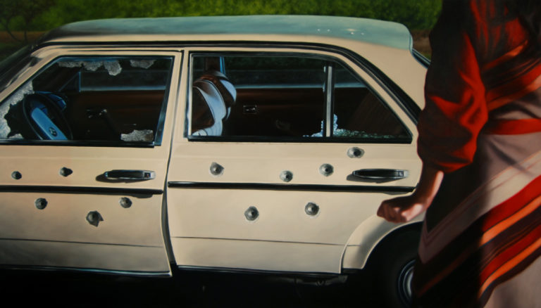 “Hay escenas que son icónicas de la serie que sólo quedaron capturadas con la foto fija. Yo tomé unas 100 imágenes, luego depuré y escogí cuáles recrear en los 17 cuadros. Una de las cosas más notorias es que todos los personajes eran hombres, no había mujeres. Por eso escogí a Diana Turbay y su relevancia en esa historia”, agrega Juan David sobre su obra.