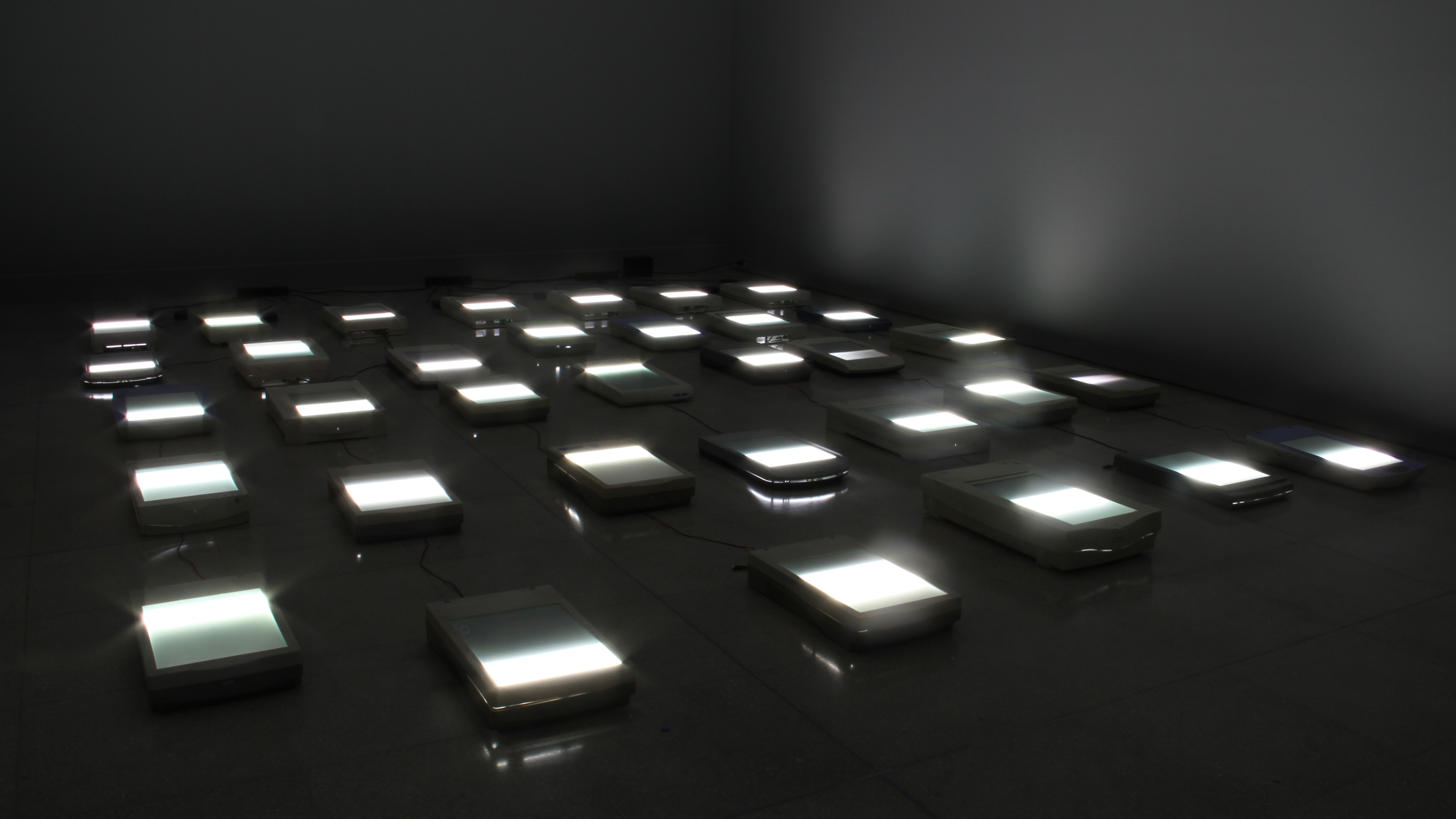 Lago / Transferencia (2010-2011 / 2013), de Ximena Díaz. Instalación con escáners / Video HD monocanal, 9’