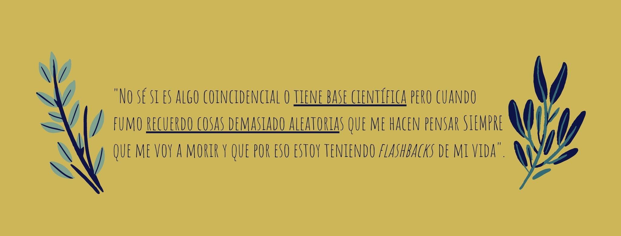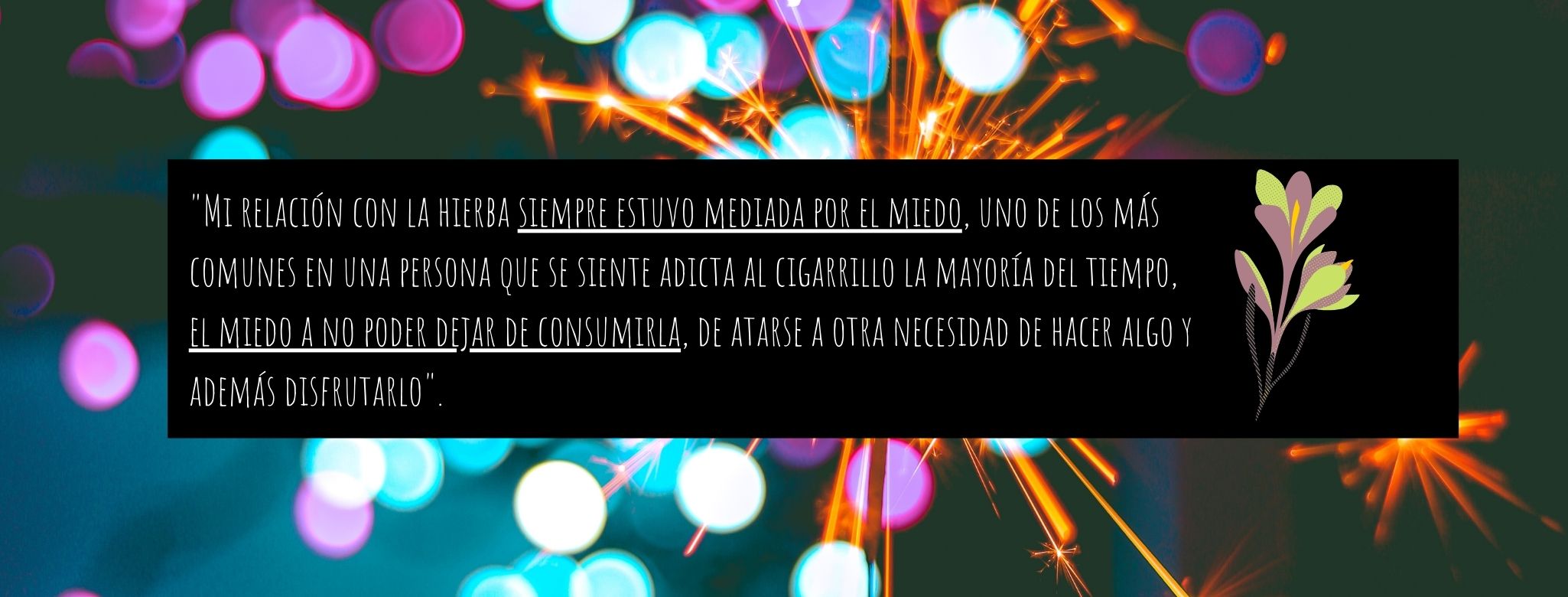 Ya no se me duermen las piernas ni las manos, ya me doy la libertad de fumar cuando quiero y de no hacerlo si no tengo ganas, ahora también puedo leer, escribir e incluso trabajar o cocinar después de haber fumado, aunque me siga sintiendo más cómoda sentada y sólo escuchando música, ya también puedo mantener una conversación telefónica con mi mamá sin sentir que se va a dar cuenta y entonces escuchar otro pequeño miedo, pero lo más importante ha sido descubrir que a mí también me gusta un poco más cuando fumo porque me da menos miedo ser ocurrente, decir las cosas como las estoy pensando, e incluso hacer chistes; después de fumar soy más la persona que tal vez siempre he querido ser y no la que he terminado siendo, y por supuesto, empezar a serlo sin necesidad de haber fumado.