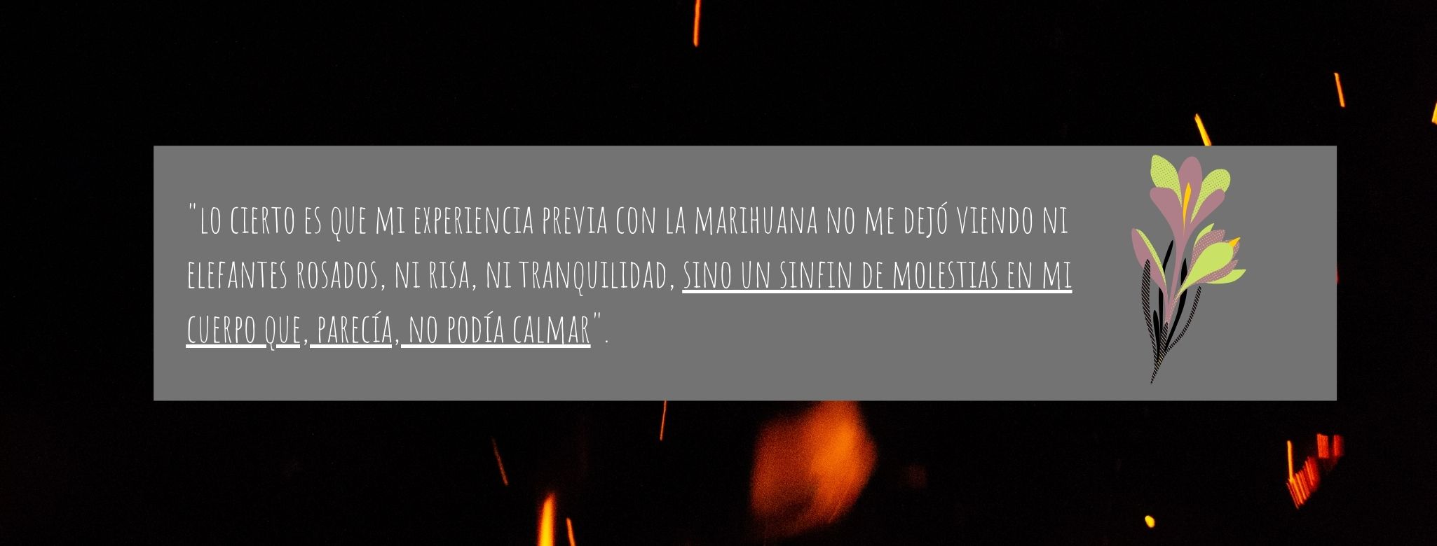 Aunque con mis circunstancias actuales tal vez la pruebe primero medicinal para contrarrestar los efectos adversos de la quimioterapia, ¡Quién sabe!, lo cierto es que mi experiencia previa con la marihuana no me dejó viendo ni elefantes rosados, ni risa, ni tranquilidad, sino un sinfin de molestias en mi cuerpo que, parecía, no podía calmar.