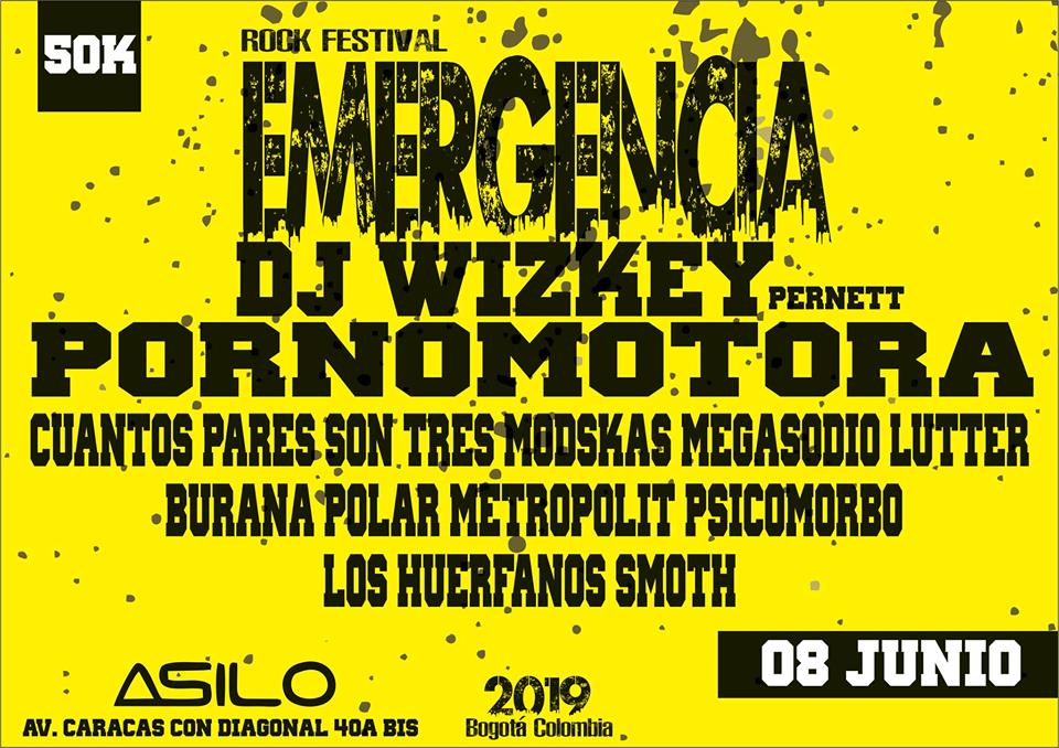 El ‘antifestival’ como lo llama, Jhoan Calderón, uno de sus organizadores y mentes detrás del festival, quiere crear un nuevo espacio integrando cada punto de la ciudad, además de mostrar que en Bogotá todavía se rockea y que lo que hay es talento, es por esto que junto a la Pornomotora y Pernett (Dj Wizkey) se estarán presentando 8 agrupaciones emergentes, que llenarán la noche capitalina de sonidos contundentes, en lo que será el Festival Emergencia el cual se llevará a cabo el próximo 8 de junio en Asilo Bar.