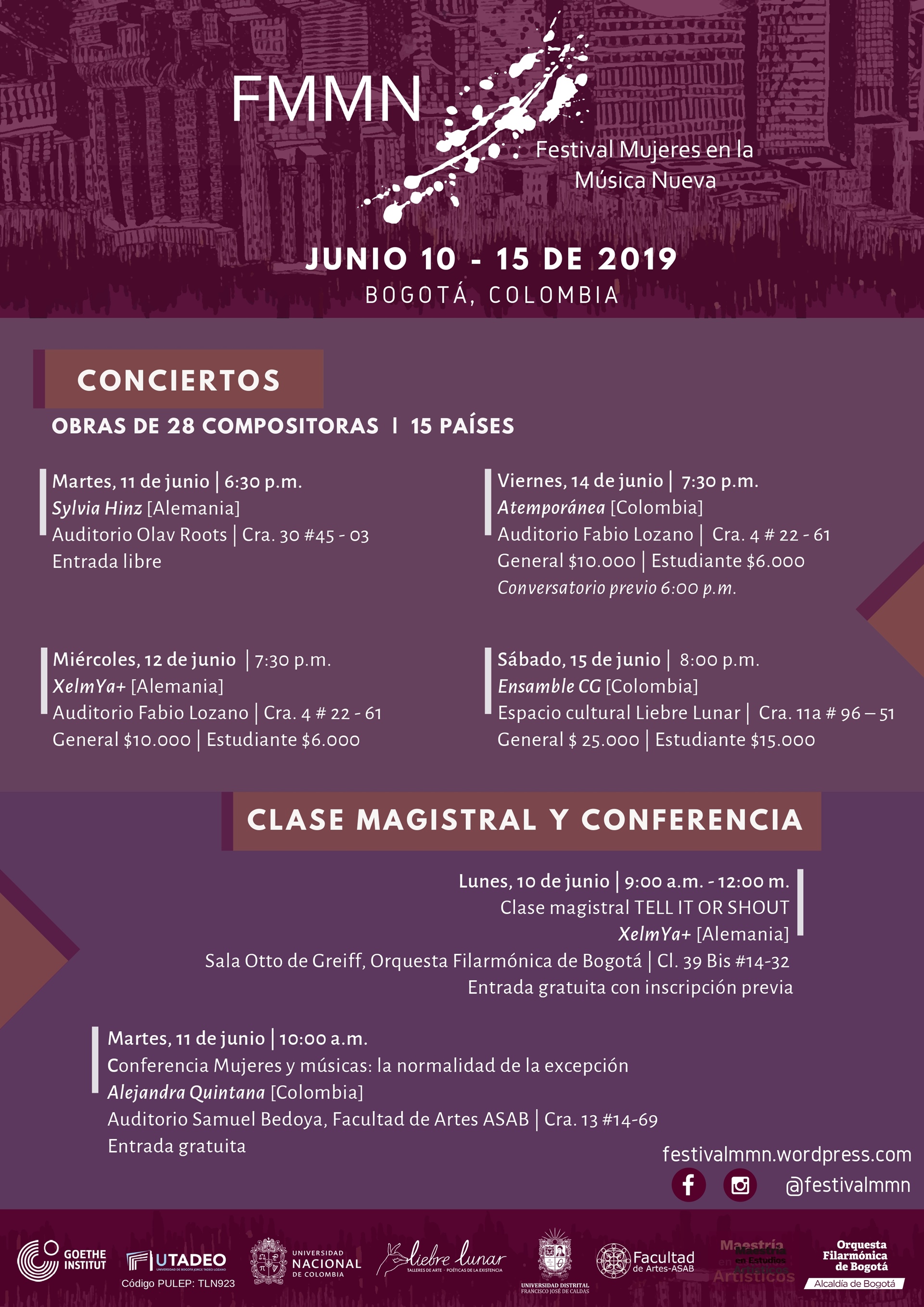 El Festival Mujeres en la Música Nueva 2019, que se realizará entre el 10 y el 15 de junio en la ciudad de Bogotá, es un espacio para divulgar y promover el trabajo de las mujeres en la música académica contemporánea y experimental.