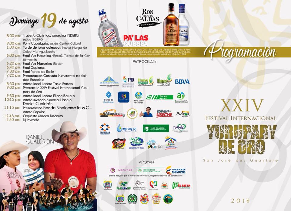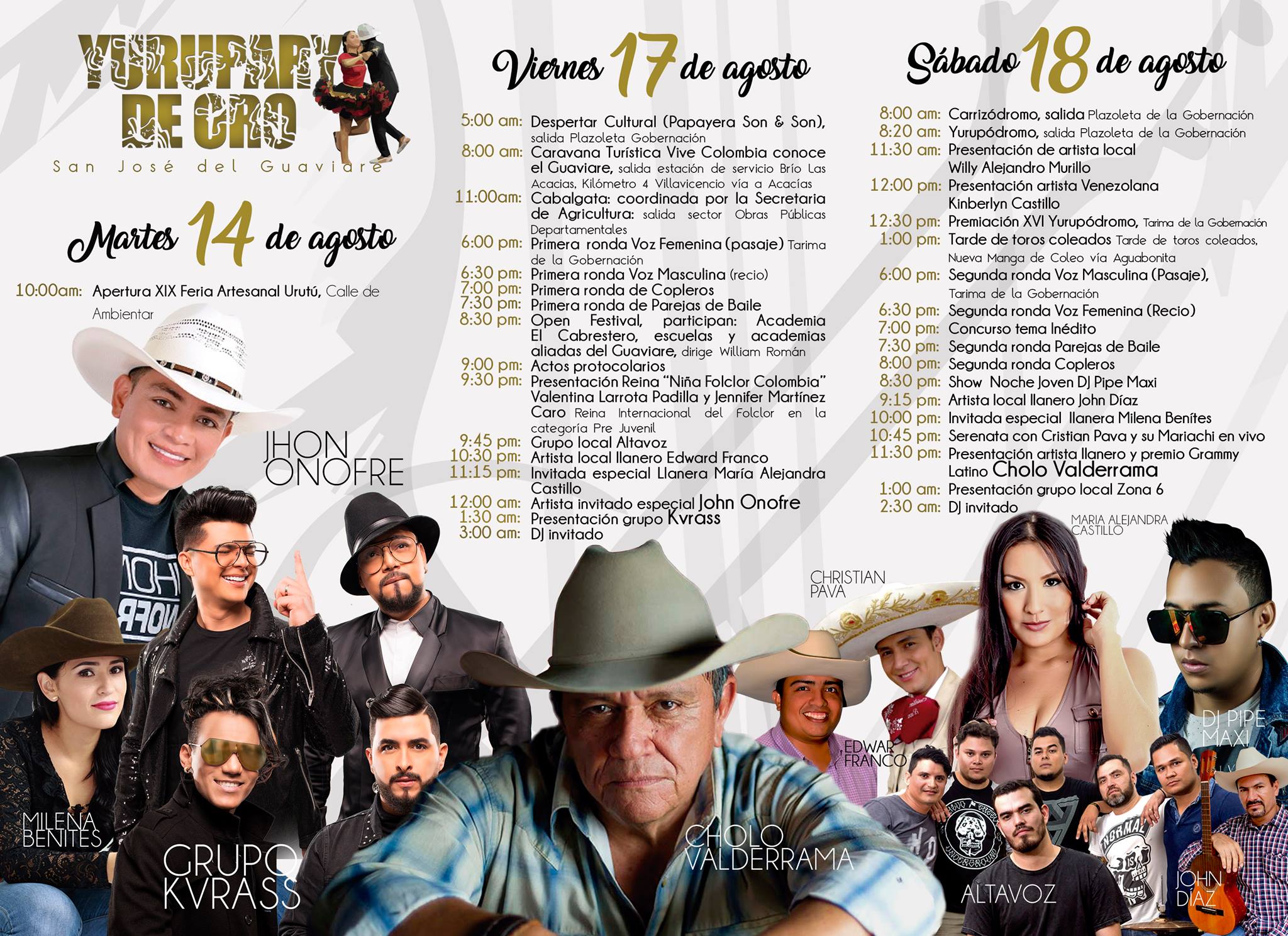El Festival Internacional Yurupary de Oro es una de las más grandes expresiones folclóricas y culturales del Guaviare. Este año contará con el tradicional Yurupódromo, los concursos de baile de joropo, voz llanera femenina y masculina, contrapunteo, tema inédito, grupos instrumentales, la presencia de artistas nacionales e internacionales y muchs actividades más.