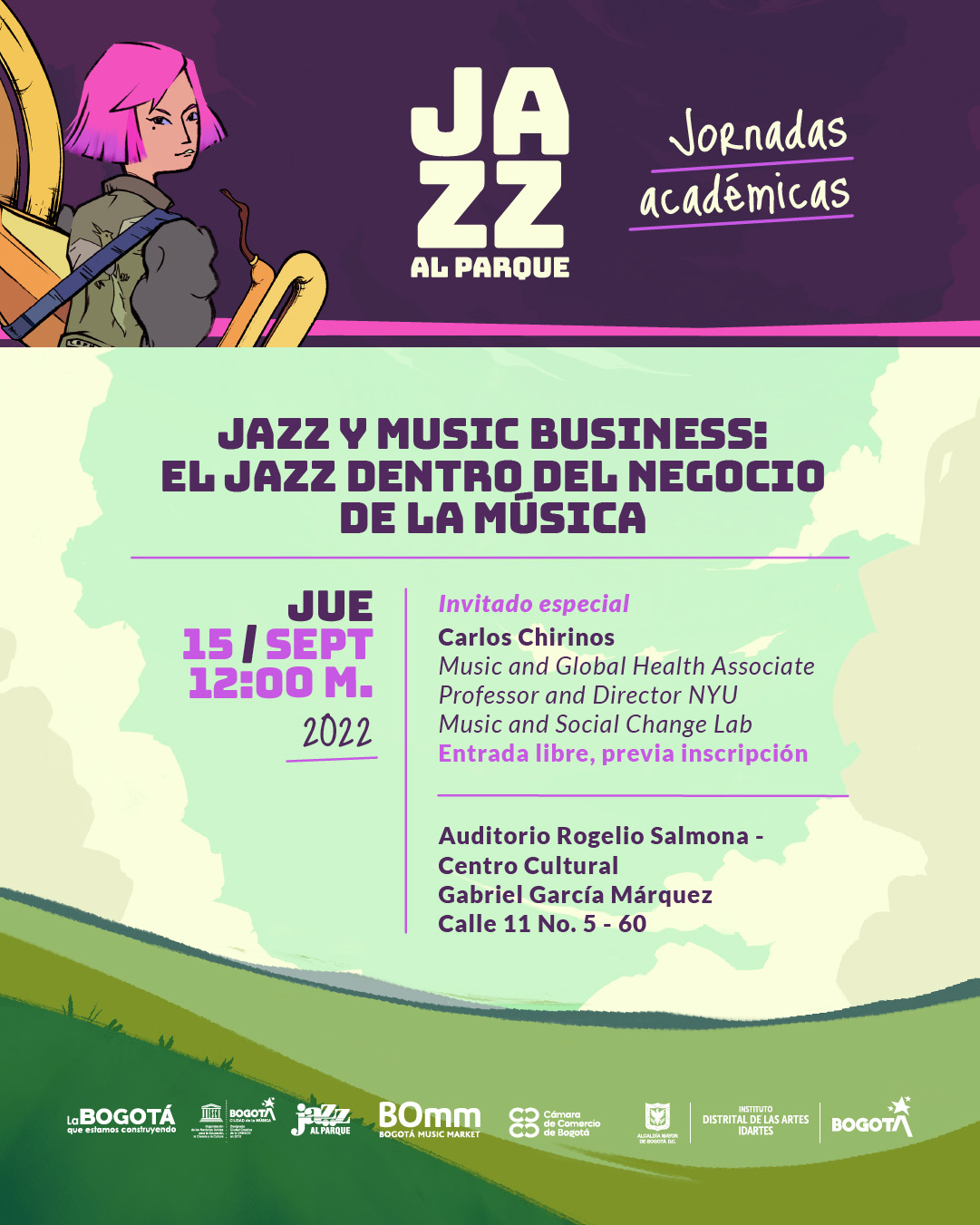 El jueves 15 de septiembre a las 12:00 m., Carlos Chirinos, profesor asociado de Música y Salud Global de la Universidad de Nueva York, donde es director del laboratorio de Música y Cambio Social, brindará la charla para músicos, agentes de la industria y gestores Jazz y music business: el jazz dentro del negocio de la música, en la que explorará distintas herramientas y oportunidades para propuestas de este género en la industria global de la música.