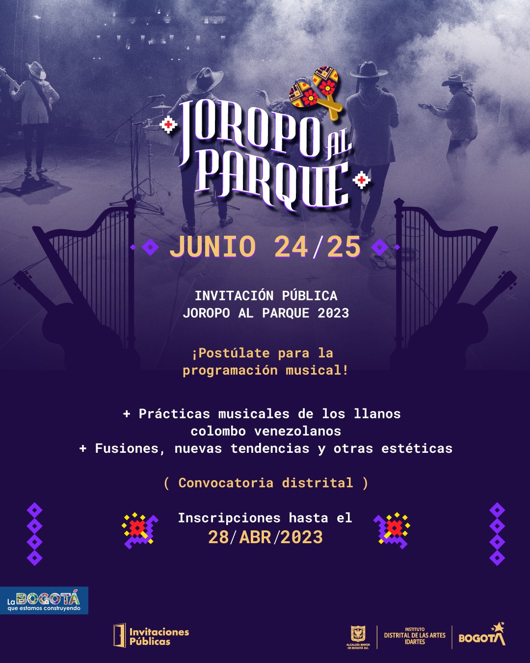 Este año, el Festival Joropo al Parque 2023 se realizará los días 24 y 25 de junio en la Plaza de Bolívar con diversas expresiones artísticas de los Llanos Orientales y la participación de artistas distritales, nacionales e internacionales.