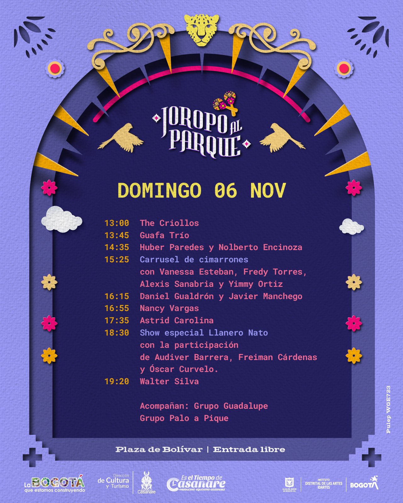 También habrá diferentes presentaciones especiales dedicadas a las leyendas del joropo y, el domingo 6 de noviembre, entre 10:00 a.m. y 1:00 p.m., en paralelo a la tarima de la Plaza de Bolívar, por la Carrera Séptima, entre calles 12 y 15 será el lugar para el Llanódromo, que albergará a diferentes exponentes de la danza llanera tradicional y académica, así como las nuevas creaciones y tendencias en torno a la cultura de los llanos colombo venezolanos.