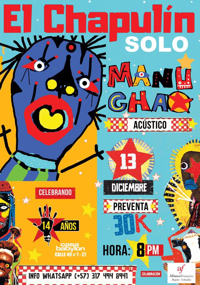 'Soñé Colombia' y 'Matanza' serán canciones que de seguro harán parte de la presentación de Manu Chao que ha creado un gran vinculo con Colombia desde hace más de 20 años cuando hizo parte de la agrupación Mano Negra y como solista. Ahora el 13 de diciembre habrá una nueva cita para ver al artista.