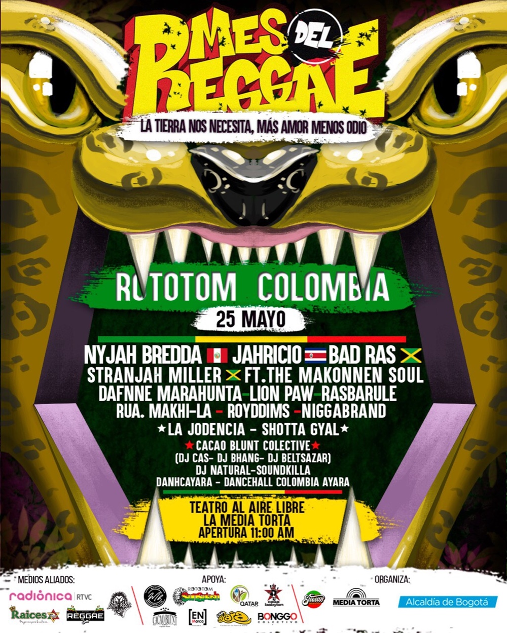 Por último, el concierto Rototom Colombia, en el teatro al aire libre La Media Torta, será el 25 mayo con artistas internacionales invitados que llegan desde Jamaica, Perú y Costa Rica para dar un cierre de lujo al mes del reggae.