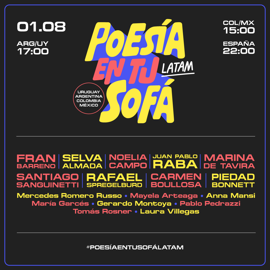 Sin una gota de timidez, la poesía y las voces detrás de ella decidieron emprender un viaje apoyado de las TICs para difundir cultura. España, Argentina, Uruguay, México y, efectivamente, Colombia llevan magia y literatura a cada uno de los sofás con el Festival Poesía en tu Sofá, cuentas de Instagram que cada uno de los países ha construido de manera independiente, pero que el SÁBADO 1 DE AGOSTO, a las 22:00 España, 15:00 COL/MÉX y 17:00 ARG/UY se encontrarán en un solo lugar para hacer el primer maratón LATAM de 'Poesía en tu Sofá'.